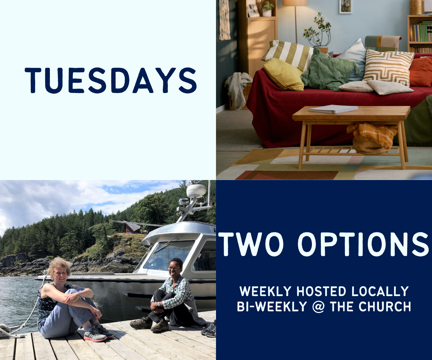 While each group has a slightly different rhythm and focus, all have the same goal of nurturing our relationship with God and with others. We do this by studying the bible and praying, listening to others’ stories and sharing our own, helping out with projects to bless our neighbourhood, and spending time just being together and having fun.